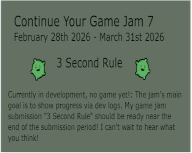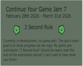 Currently in development, no game yet!: The "Continue Your Game 7" game jam's main goal is to show progress via dev logs. My game jam submission "3 Second Rule" should be ready near the end of the submission period! I can't wait to hear what you think!